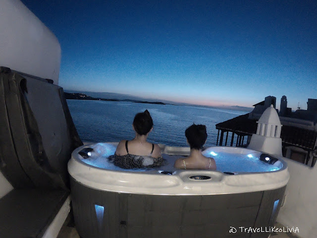 Going to watch our very last Mykonos sunset in the jacuzzi tub and playing games at the same time!
